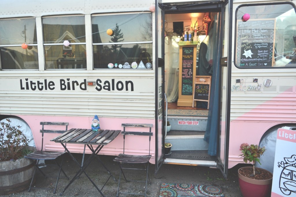 In 2013 while being an educator to student stylists at the TONI&GUY Academy in Bellingham I started cutting hair on the side on  Lopez Island when I would go to visit my family. As my clientele there grew I found myself thinking about how cool it would be to bring a salon to the island instead of doing house calls, and the Little Bird Salon vision was born. With the support of a generous family member I was able to buy a small bus that I turned into my very own colorful, welcoming and fully functional mobile salon. After finding a permanent home at GOODS Local Brews I decided to put the travel idea on hold and enjoy a steady place in Bellingham.